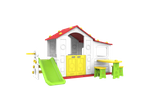 Duży Domek ogrodowy 5w1 dla dzieci + Zjeżdżalnia + Koszykówka + Ogródek + Stolik + 2 Krzesełka Czerwony Dach